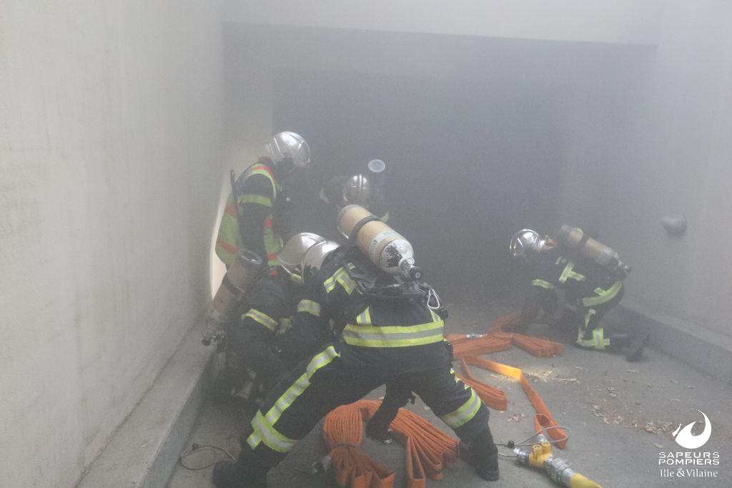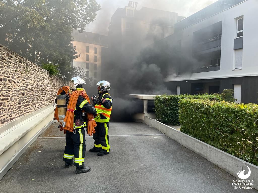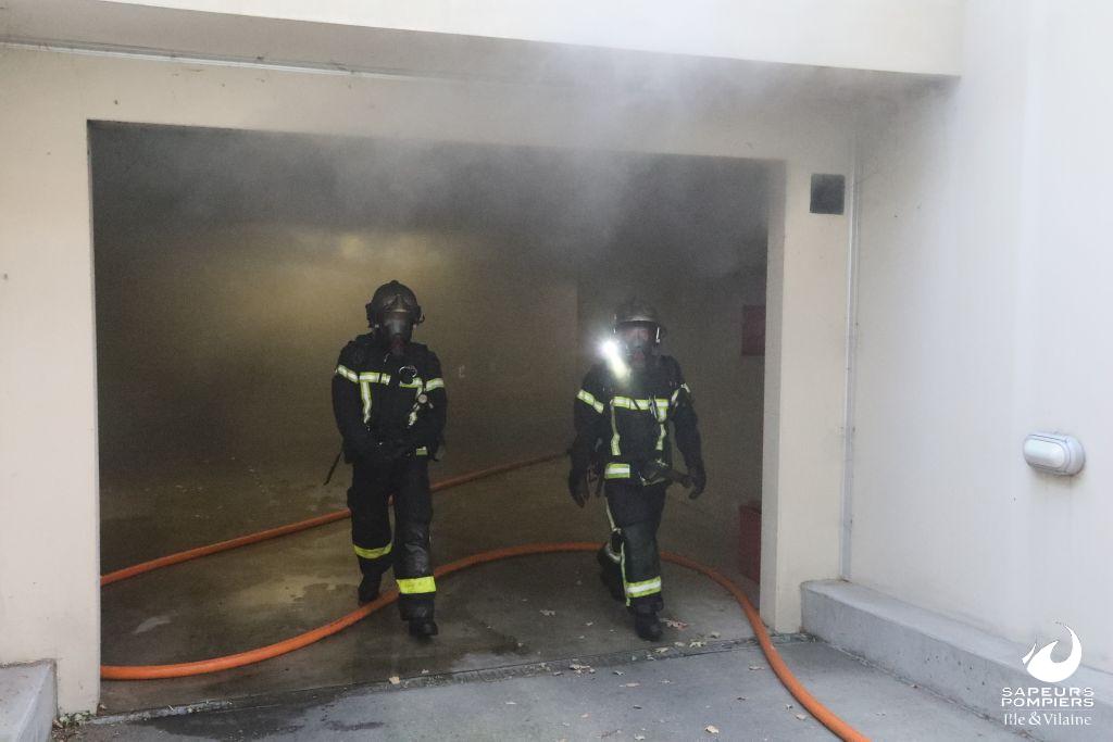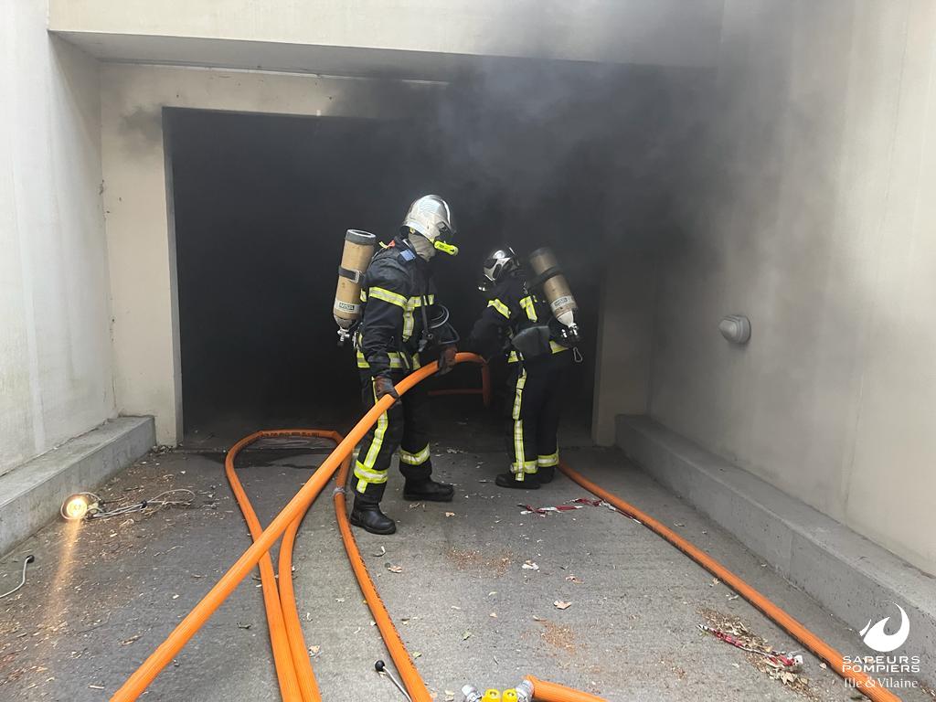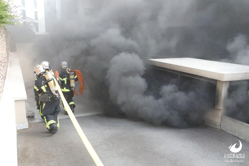 Feu de voiture dans un parking souterrain rue Jean Milon à Rennes le 19 juillet 2022